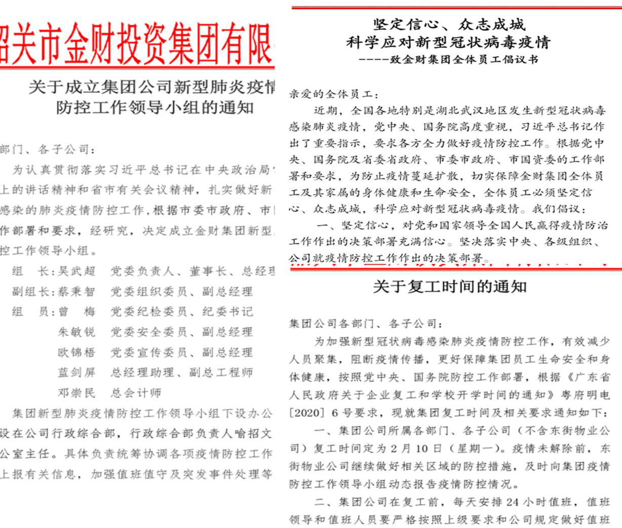 自新型肺炎疫情發(fā)生以來,市金財集團高度重視,堅決執(zhí)行黨中央決策部署,嚴格按照省委省政府、市委市政府及市國資委的工作要求,把疫情防控工作作為當前最重要的工作來抓。集團領(lǐng)導(dǎo)班子強化政治擔當,深入到疫情防控一線靠前指揮、通力協(xié)作、落實責任,確保各項防控措施有序開展,為全市打好群防群治疫情防控阻擊戰(zhàn)提供堅強保證。一、高度重視、強化領(lǐng)導(dǎo) 集團迅速成立新型肺炎疫情防控工作領(lǐng)導(dǎo)小組,由黨委負責人、董事長、總經(jīng)理吳武超任組長,黨委委員、副總經(jīng)理蔡秉智任副組長,統(tǒng)籌指揮集團各項疫情防控工作,并針對防疫的重點區(qū)域,專題研究部署相關(guān)工作,統(tǒng)一集團上下思想,將防控工作作為當前重點工作,以人民群眾生命健康安全為重中之重,全力以赴、有力有效做好新型冠狀病毒感染的肺炎疫情防控工作。 ![]() 二、落實責任、迅速行動 集團新型肺炎疫情防控工作領(lǐng)導(dǎo)小組指導(dǎo)各項目成立“防控小組”,統(tǒng)籌人力及物料的使用,各項目負責人員提前到位,建立員工“日報制度”,電話保持暢通;啟用智能釘釘“每日健康打卡”系統(tǒng),每日監(jiān)測員工健康狀態(tài)及位置動態(tài)信息,及時統(tǒng)計上報領(lǐng)導(dǎo)小組及市國資委,向全集團公司員工及員工家屬下發(fā)了《致金財集團全體員工倡議書》,號召全體員工及家屬堅定信心、眾志成城,科學(xué)應(yīng)對新型冠狀病毒疫情;此外,集團還積極主動協(xié)調(diào)采購儲備了一批口罩、84消毒液、手套等防疫物資,極大的保障了疫情防控工作的順利進行。 ![]() 三、大力宣傳、普及知識 根據(jù)集團統(tǒng)一部署,物業(yè)公司于1月23日(年二十九)在韶鋼家屬區(qū)、金港灣小區(qū)、百年東街、西河全民健身廣場、創(chuàng)業(yè)廣場等人流密集區(qū)域,利用各區(qū)域LED屏、健康宣傳欄、微信公眾號等方式進行“防控新型冠狀病毒知識”宣傳,讓市民及社區(qū)居民了解防護的重點及衛(wèi)生知識,并于1月24日(年初一),緊急印刷一批《溫馨提示》《健康小知識》,在各區(qū)域張貼派發(fā)。 四、堅守一線、嚴防嚴控 面對突如其來的疫情,在市國資委的正確領(lǐng)導(dǎo)下,集團公司迎難而上,勇于擔當,針對管理的各防疫區(qū)域,尤其是擁有數(shù)萬人居住的韶鋼家屬區(qū),按照“守土有責、守土擔責、守土盡責”的要求,將各項防控措施落細落實落到位。 (一)封閉行動。在1月26日(年初二)開始,對各小區(qū)進行封閉行動,禁止外來人員及車輛進入。同時積極溝通勸導(dǎo)各轄區(qū)內(nèi)的電影院、酒吧、書店等商業(yè)體停業(yè),減少人員交叉感染的機會。 (二)敲門行動。從1月27日(年初三)開始,對各管轄小區(qū)進行入戶排查,同時配合街道、派出所進行入戶測體溫、問卷等工作。排查出韶鋼家屬區(qū)一例武漢回韶人員,三臺湖北籍車輛,迅速上報各相關(guān)單位,并協(xié)助加強管控。 (三)體溫檢查。從1月26日(年初二)開始,一是在各轄區(qū)設(shè)立體溫檢測點;二是對所有上崗員工進行體溫檢查;三是對各轄區(qū)出入人員進行體溫檢查;同時加大各區(qū)域巡查力度,防止外來人員進入。 (四)取消集會。從1月24日(年三十)開始,取消百年東街、西河健身廣場過年期間所有活動,同時取消各項目會議,人員聚集,減少病毒交叉?zhèn)魅镜臋C會。 (五)積極協(xié)助相關(guān)部門開展工作。積極協(xié)助社區(qū)街道、轄區(qū)派出所、區(qū)住建局、區(qū)政府開展疫情管控工作。一是在各區(qū)域建立口罩回收點,特別是韶鋼社區(qū)安排專門回收舊口罩,并送去松山醫(yī)院定點銷毀;二是協(xié)助相關(guān)部門上門開展問卷調(diào)查;三是加強對外來人員的管理;四是加強對麻將館、棋牌室的清理,防止人員聚集。 (六)消毒工作。從1月24日(年三十)開始,對各管轄區(qū)域進行消毒工作,每日進行。同時強制各區(qū)域商家配戴口罩開展經(jīng)營。 金財集團作為市屬國有企業(yè),我們堅定信心、眾志成城,科學(xué)應(yīng)對新型冠狀病毒疫情,在疫情面前積極作為、勇于擔當、攻堅克難,堅決做到守土有責、守土擔責、守土盡責。 ![]() |