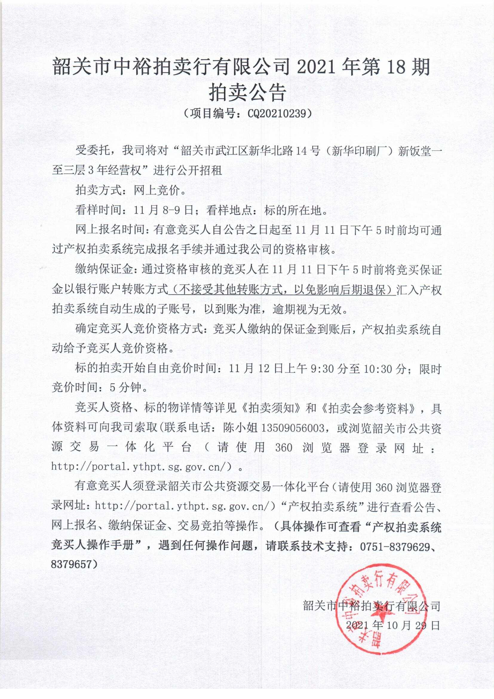 韶關(guān)市中裕拍賣行有限公司2021年第18期拍賣公告(項(xiàng)目編號(hào):CQ20210239)發(fā)布時(shí)間:2021-10-29 | 作者: | 點(diǎn)擊:0次