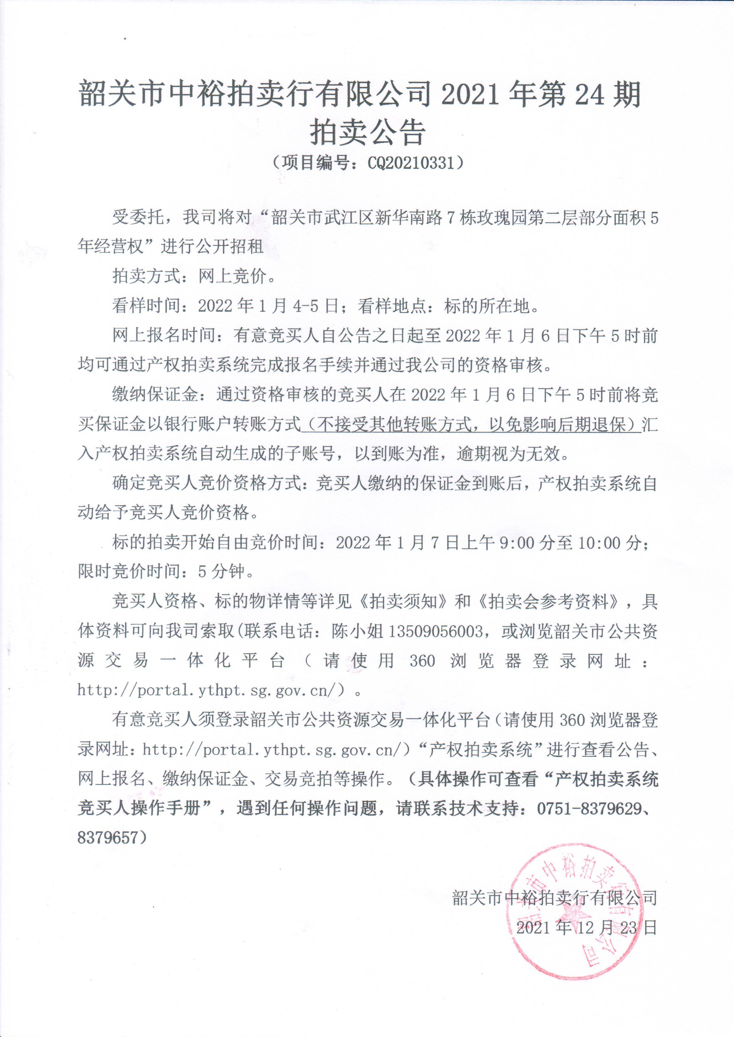 韶關(guān)市中裕拍賣(mài)行有限公司2021年第24期 拍賣(mài)公告 (項(xiàng)目編號(hào):CQ20210331)發(fā)布時(shí)間:2021-12-24 | 作者: | 點(diǎn)擊:0次