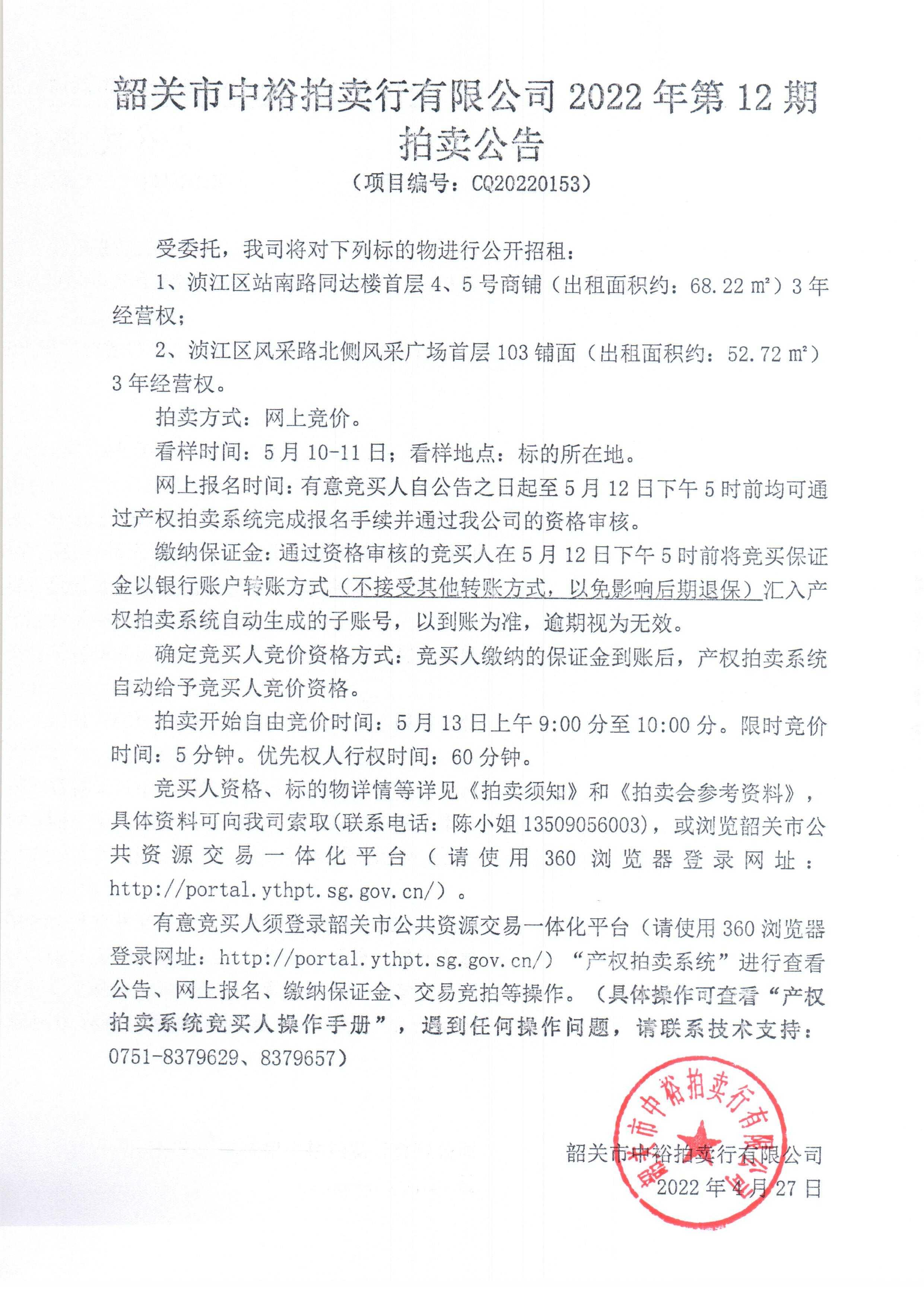 韶關(guān)市中裕拍賣行有限公司2022年第12期拍賣公告發(fā)布時(shí)間:2022-04-28 | 作者:陳耀英 | 點(diǎn)擊:0次