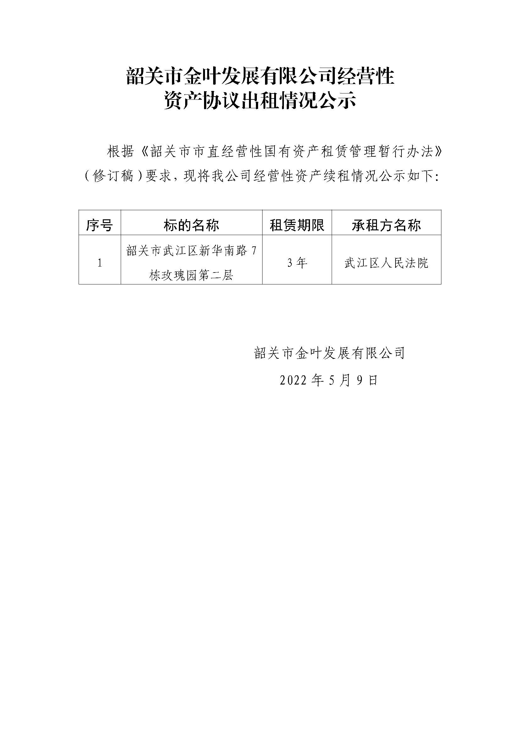 韶關(guān)市金葉發(fā)展有限公司經(jīng)營(yíng)性資產(chǎn)協(xié)議出租情況公示發(fā)布時(shí)間:2022-05-10 | 作者:陳耀英 | 點(diǎn)擊:0次