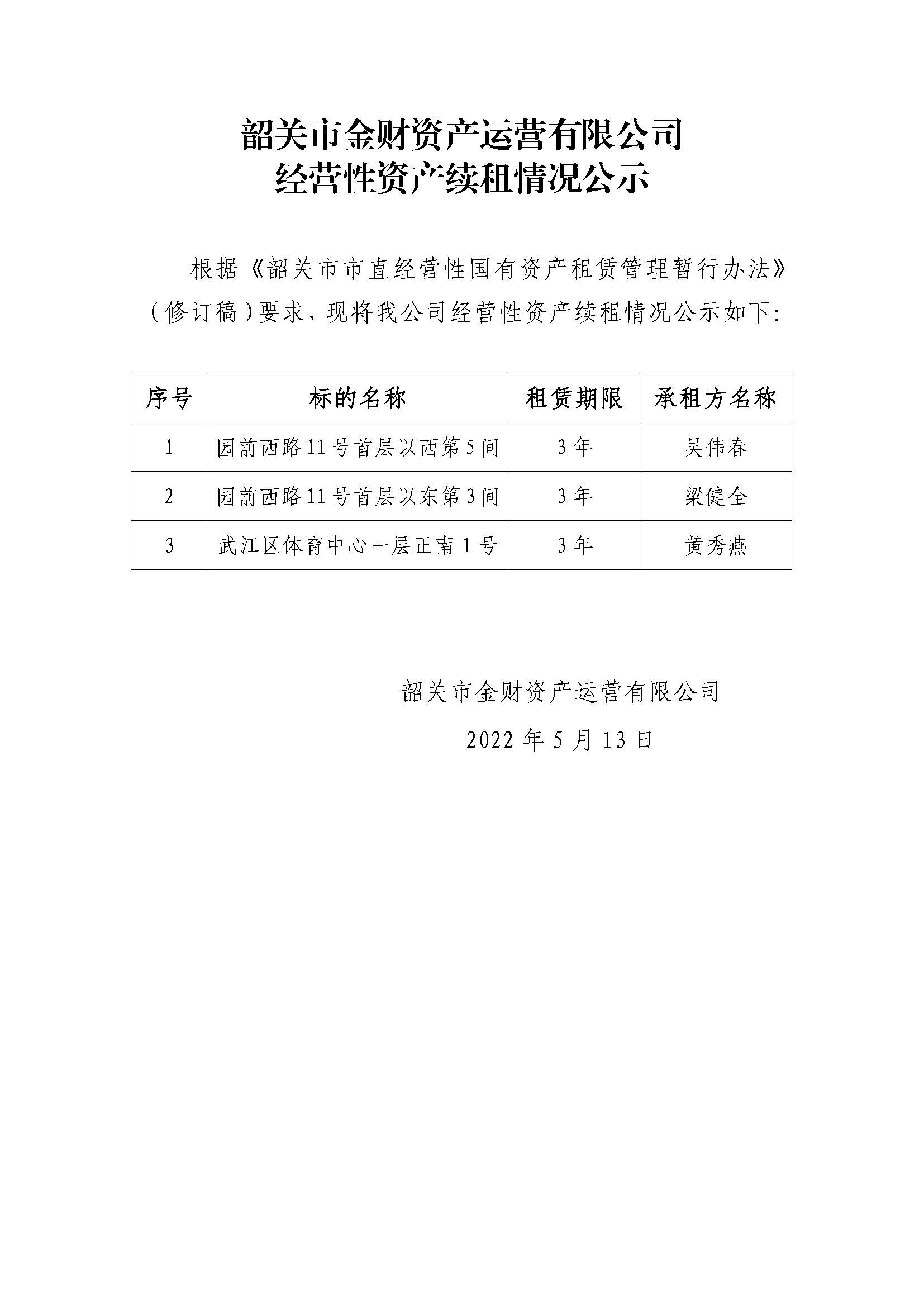 韶關(guān)市金財(cái)資產(chǎn)運(yùn)營(yíng)有限公司經(jīng)營(yíng)性資產(chǎn)續(xù)租情況公示發(fā)布時(shí)間:2022-05-16 | 作者:陳耀英 | 點(diǎn)擊:0次