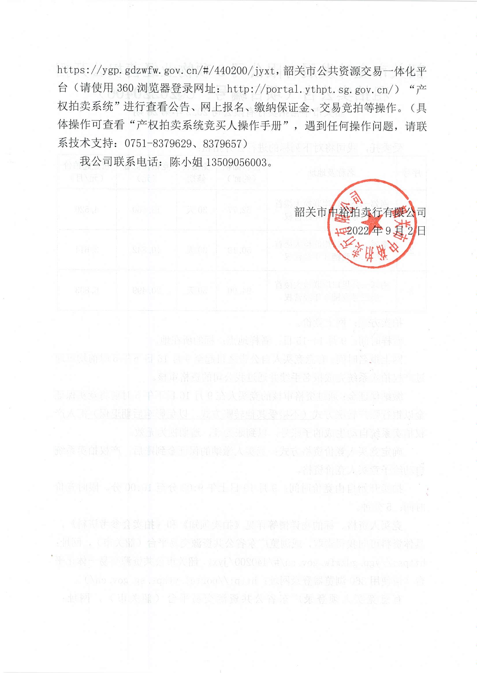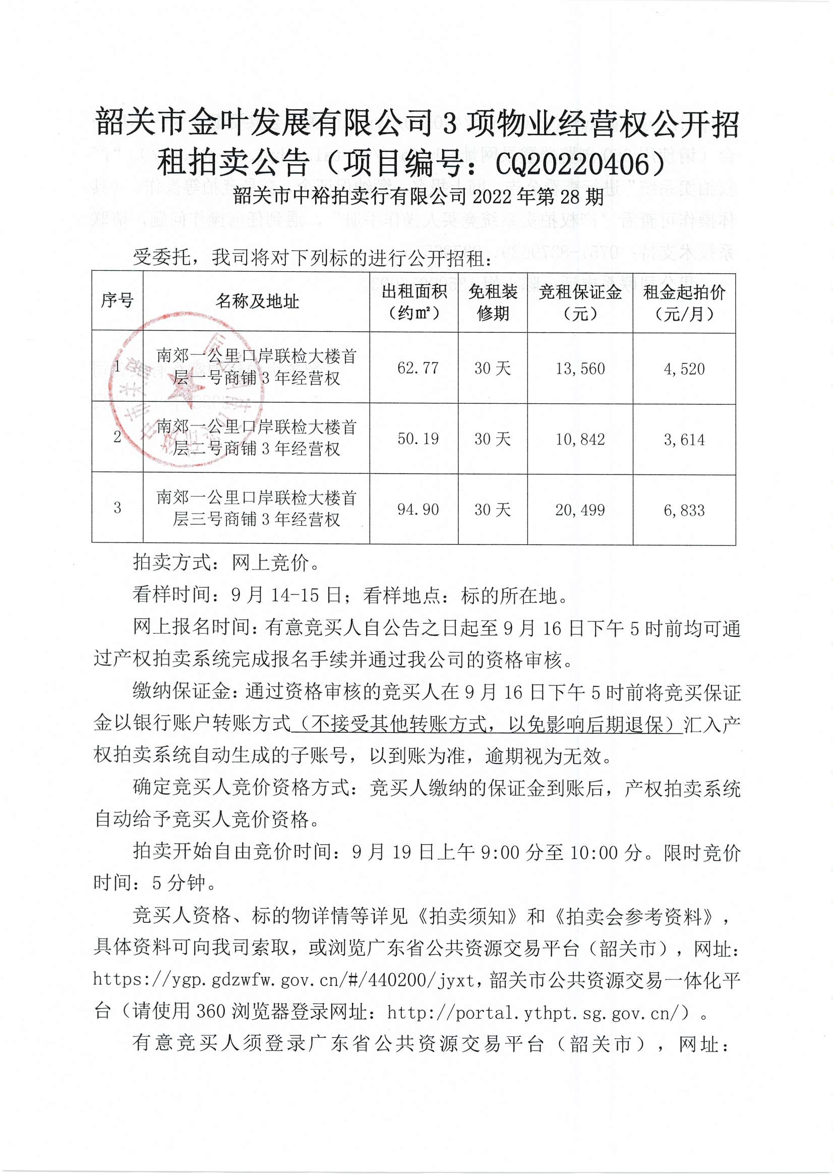 韶關(guān)市金葉發(fā)展有限公司3項(xiàng)物業(yè)經(jīng)營權(quán)公開招租拍賣公告(項(xiàng)目編號:CQ20220406)發(fā)布時間:2022-09-02 | 作者: | 點(diǎn)擊:0次