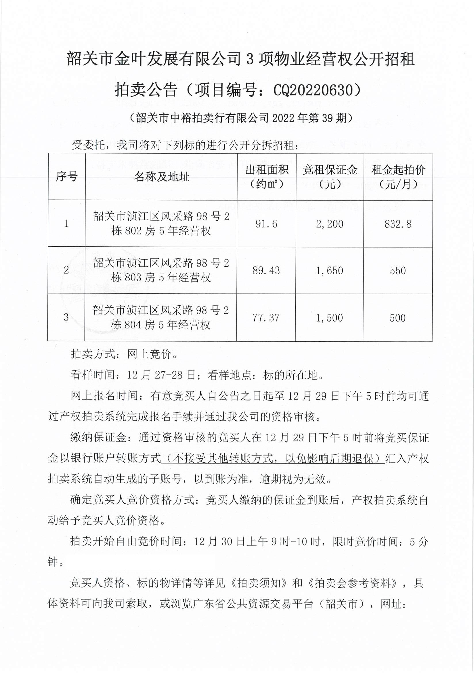 韶關(guān)市金葉發(fā)展有限公司3項(xiàng)物業(yè)經(jīng)營(yíng)權(quán)公開招租拍賣公告發(fā)布時(shí)間:2022-12-16 | 作者: | 點(diǎn)擊:0次