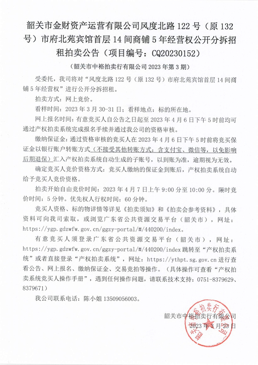 金財資產(chǎn)公司風(fēng)度北路122號市府北苑賓館首層14間商鋪5年經(jīng)營權(quán)公開分拆招租拍賣公告發(fā)布時間:2023-03-23 | 作者: | 點(diǎn)擊:0次