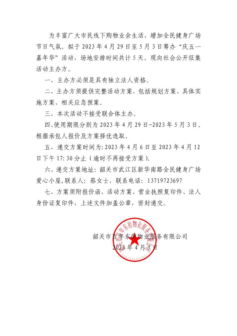 新華南路全民健身廣場2023年4月29日-5月3日“五一”活動發(fā)包公告