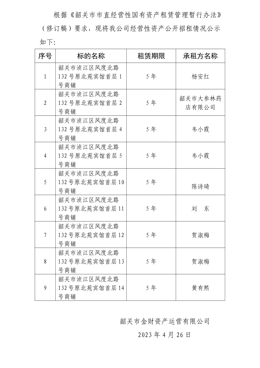 韶關(guān)市金財(cái)資產(chǎn)運(yùn)營(yíng)有限公司經(jīng)營(yíng)性資產(chǎn)公開招租情況公示發(fā)布時(shí)間:2023-04-26 | 作者: | 點(diǎn)擊:0次